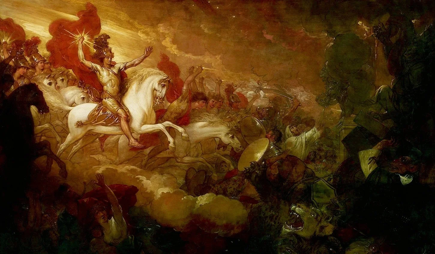 The Destruction of the Beast and the False Prophet, by Benjamin West. The last battalion in the final War, commanded by the Last Avatar, will mark the End of the White Fraternity and its infernal Abode, Chang Shambalah. After the Last Battle, there will be no more Zionism, Freemasonry, Marxism, Capitalism, Vatican, degradation, usury, violence, war, theft, etc.