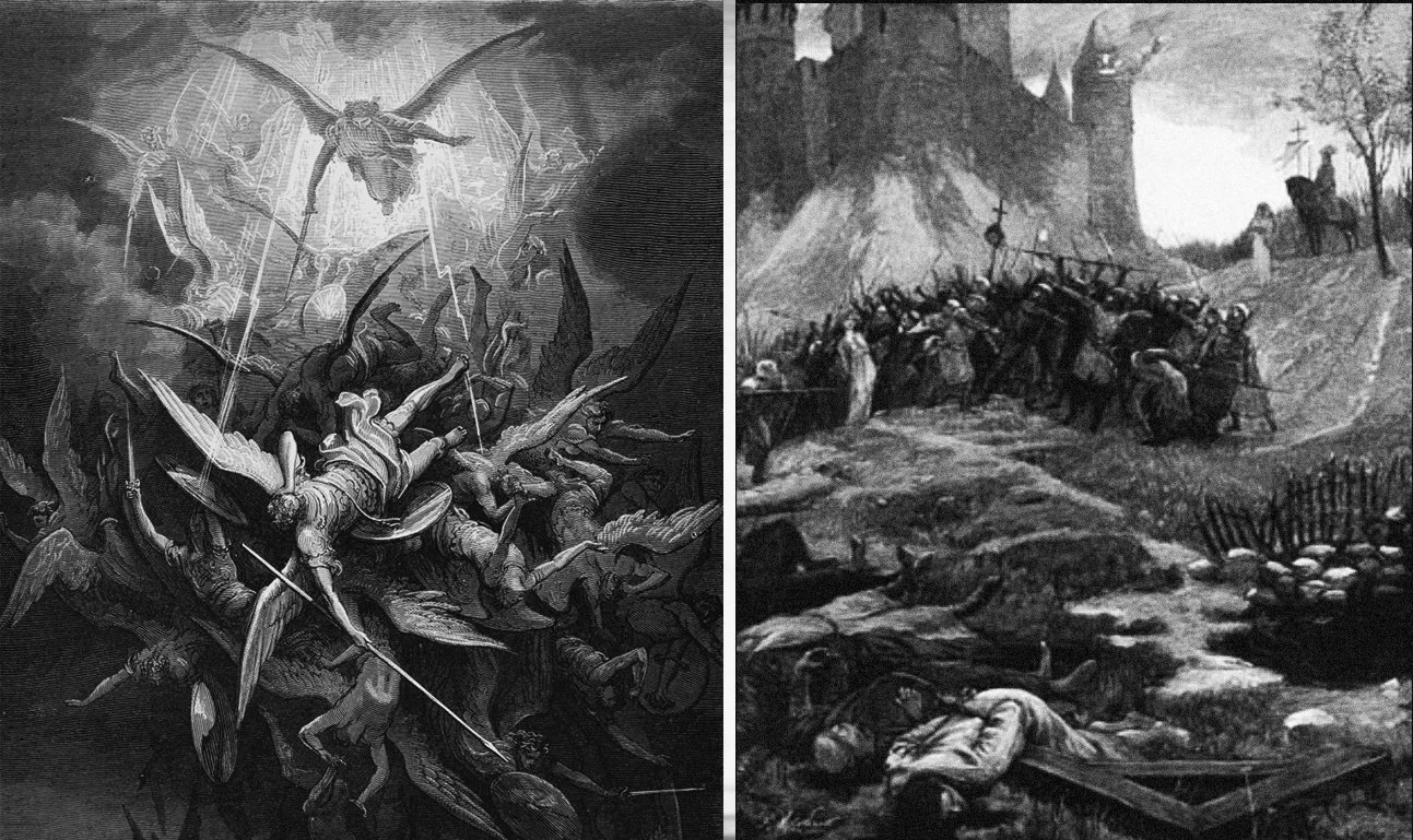 War in heaven, Illustration by Gustave Doré (left). Massacre at Béziers, Albigesian cruzade (right). “The Grail, hidden by the Cathars, was a jewel fallen from the Crown of Lucifer [Earendel], broken in his combat in the heavens, when Hyperborea and Atlantis were destroyed” - Miguel Serrano.