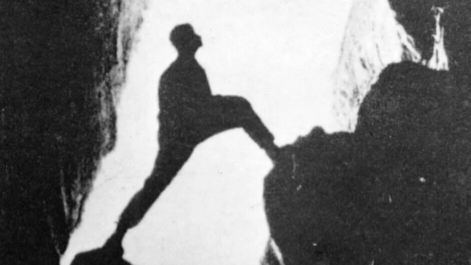Otto Rahn walking in deep loneliness, next to his lamp, illuminating the dark labyrinths of the many caves in the Languedoc.